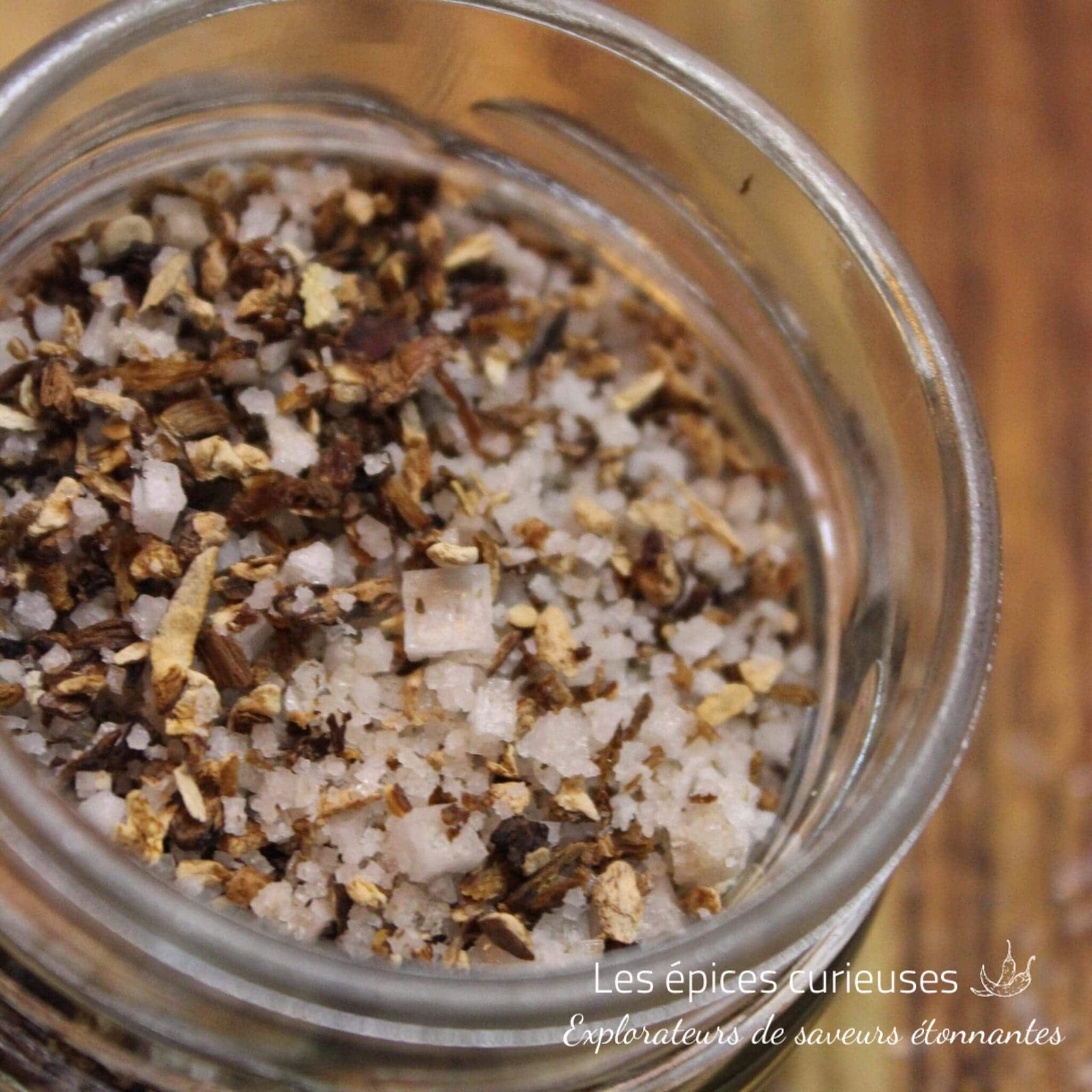Ce mélange est composé de Fleur de Sel, un sel marin récolté à la main sur les marais salants de Guérande, et de granulés de champignons, soigneusement sélectionnés pour leur saveur unique.