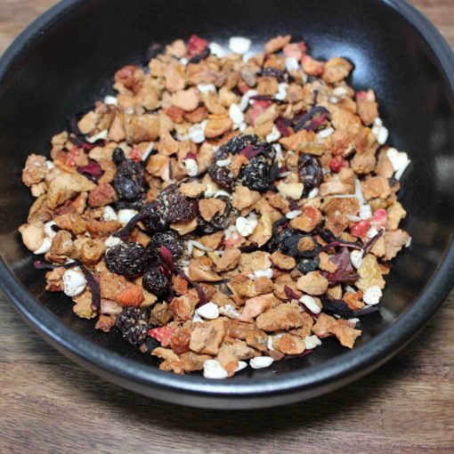 La Tisane – Coucou les enfants est composée de morceaux de pomme, raisins (raisins, huile de tournesol), flocons de noix de coco, morceaux de carottes, cannelle, arôme naturel de fraise, fleurs d’hibiscus, sarrasin, morceaux de fraises.